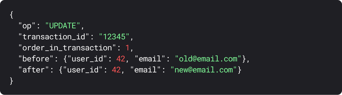Here's what this looks like - when a user updates their email address, the CDC event might look like: